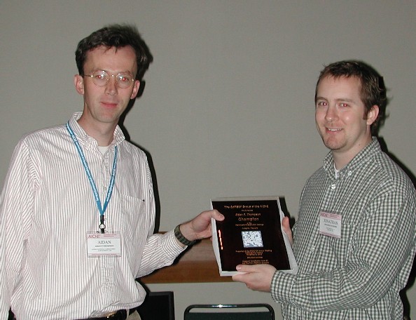 Aidan Thompson (Sandia) receives the award from Jonathan Moore (Dow) of the Fluid Simulation Challenge committee